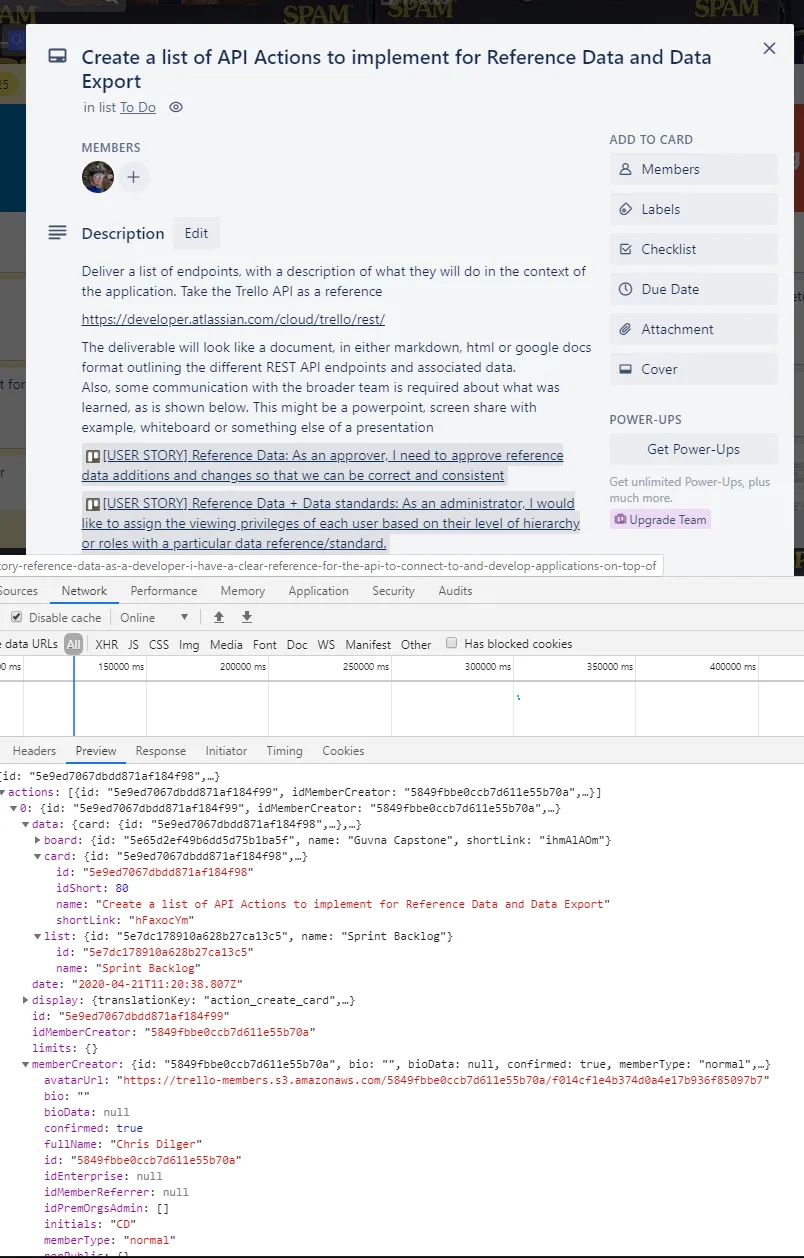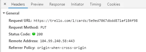 We see a PUT request went to the /1/cards/5e9ed7067dbdd871af184f98 URI to specify an action on this card with id 5e9ed7067dbdd871af184f98
